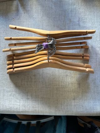 tengo unas 8-10 perchas infantiles de madera que te serán muy útiles para colgar las prendas de los más pequeños pq tienen unas pequeñas marcas para que se sujeten. 3 euros todas