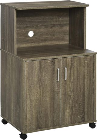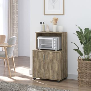 Carro de cocina compacto y versátil, ideal para espacios reducidos. Dimensiones: 60.4L x 40.3P x 97Acm, con superficie de apoyo de 57L x 26P x 35Acm. Fabricado en madera de partículas E1, ofrece un armario de 2 puertas con estante interno ajustable y un compartimento abierto con orificio para cables para pequeños electrodomésticos. Capacidad de peso: 70kg (total), 40kg (superficie), 10kg (estante). Fácil de mover gracias a las 4 ruedas, de las cuales 2 tienen freno. Montaje requerido. Perfecto para cocina, sala de estar o dormitorio, ayuda a mantener todo en orden.