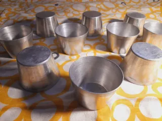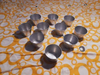 Conjunto de diez pequeños moldes para flan. En Buen Estado ; En Aluminio ; Por limpieza de Armario, se Vende ; El Precio es por el Conjunto ; Alto Cada Uno : 5 cms ; Diámetro Culo : 5 cms ; Diámetro Arriba : 7 cms ; Peso Cada Uno Aprox. : 20 grs ; Peso Total Aprox. : 220 grs ; Por Favor, No Dejes de Curiosear por todos mis Artículos ; Muchas gracias. - Fabricados en aluminio. - Diseño clásico para repostería.