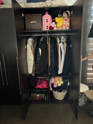 Armario como nuevo, impecable y sin ningun rasguño. Doble armario de 1m ancho cada uno con puertas abatibles, los dos tienen para colgar, estanterias y una parte tiene 2 cajones pequeños.