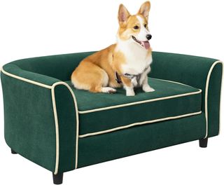 Sofá para Perros de Tamaño Pequeño y Mediano Elegante con Cojín, Sofá para Perros en Tejido Efecto Terciopelo y Madera, 79X56X35 Cm, Verde Oscuro