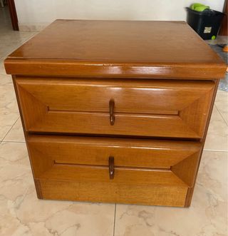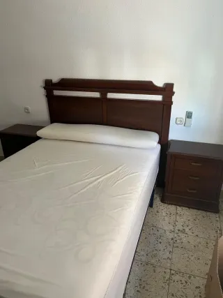Conjunto de mesita de noche, armario, mueble de cama + colchón. Mesita de noche de madera con tres cajones. Con medidas: - ancho: 53cm - alto: 61cm - profundidad: 36cm Armario. Con medidas: - ancho: 1 m - profundidad: 52cm - alto: 2m 6cm Mueble cama. Con medidas: - ancho: 1m 20cm - largo: 2m 5cm - alto: 1m 10cm Colchón. Con medidas - ancho: 1m 5cm - largo: 1m 90cm No se hacen envíos.