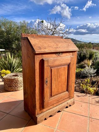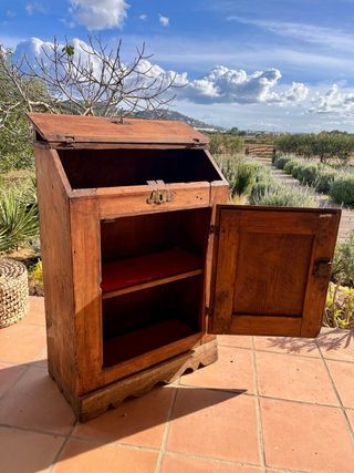 Madera maciza Estilo rústico / provenzal Tapa superior abatible y puerta con dos estantes interiores. Ideal como secreter pequeño, alacena o mueble auxiliar. Presenta una bonita pátina del tiempo y detalles tallados en la base. En buen estado general, sólido y con encanto natural. Las marcas de carcoma no están activas. Perfecto para una casa de campo, un espacio boho o un rincón con alma. Comprado en Santa Eulalia, Ibiza. Medidas: 97*67*33cm ¡Cambio de decoración en casa! Vendo todo tipo de mobiliario y artículos de decoración. Echa un vistazo a mi perfil. Llámame mejor | +34 637 735 322