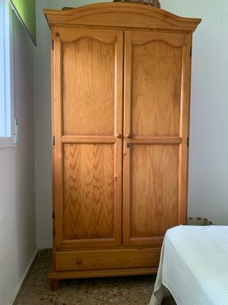 Armario de estilo provenzal, fabricado en madera maciza, mesilla de noche y cabecero a juego. - Acabado en madera natural. - Cabecero de 90cm - Mesita de noche - Armario dos puertas y dos cajones. - Armario 250€ - Mesita 50€ -Cabecero 50€