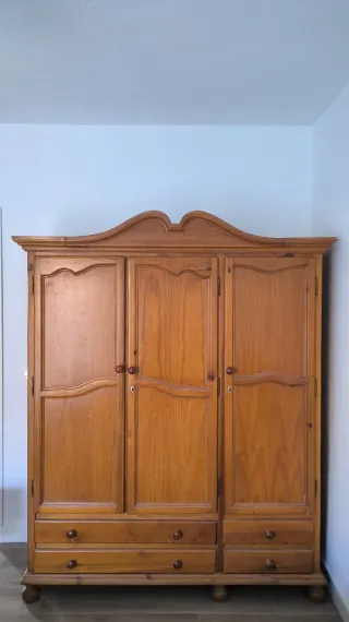Armario de madera maciza con acabado en color miel. Cuenta con tres puertas y cuatro cajones. - Diseño provenzal. - Tres puertas. - Cuatro cajones. No envío dinero en mano.