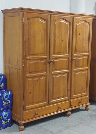 Precioso armario de madera de estilo provenzal. Se encuentra en buen estado. Listo para cargar a pie de calle - Tres puertas. Con cerradura y llaves. - Diseño clásico y elegante con molduras. - Patas torneadas. - Cajoneras completas.