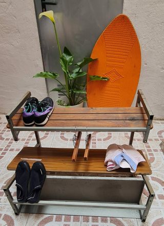 Mueble organizador de metal y madera, 4 alturas para colocar zapatos o ropa. ideal para decoración tiendas, tienda, escaparate, atrezzo, colgar perchas, con estanterías, una tabla de madera maciza, exppsitor, surfero, cool, de exposición diseño original y diferente, nautico, vestidor. zapatero, burro, burrito, antiguo, moderno, industrial, expositor,retro, vintage, armario ropero, zapatero, estanterias. Material, mobiliario de cierre de negocior. Los tableros están sueltos, se puede poner otros. Buen estado. Tengo más unidades. - Perfecto para organizar cualquier espacio. - Diseño sencillo y elegante.