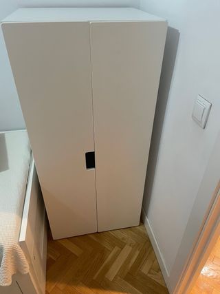 Armario ropero de Ikea, ideal para organizar tu ropa y accesorios. Su diseño sencillo se adapta a cualquier habitación. - Dos barras para colgar ropa. - Estante inferior para colocar cestas o cajas. - Puertas abatibles.