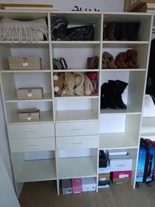 Se venden 4 módulos de vestidor de Ikea. El conjunto incluye 3 módulos de armario y 1 módulo zapatero. - Módulos de armario con barras para colgar. - Módulo zapatero con estantes. - Diseño modular y versátil.
