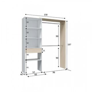 Armario vestidor de Habitdesign con diseño reversible. - Medidas: 187x158x40 cm (Alto x Ancho x Fondo). - Incluye 2 barras y 4 estantes. - Dispone de 1 cajón. - Combinación de colores Blanco Artik y Roble.