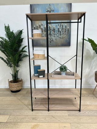 Armario vestidor con un diseño moderno y funcional. Combina una estructura resistente con estantes de madera. - Estructura de metal negro. - Estantes de madera en tono claro.