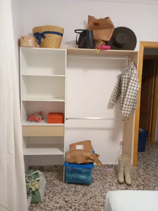 Módulo de vestidor de la marca Ikea. Su diseño es sencillo y funcional, ideal para organizar tu espacio, puedes usarlo de armario o bien de estanteria. Puedes añadirle modulos de ikea para ponerla a tu gusto - Estructura de madera. - Color blanco.