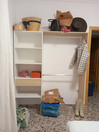 Mueble vestidor modular con varios compartimentos y cajones. - 4 cajones que los puedes colocar como quieras o juntos separados de dos en dos etc... -el compartimento para maletas es un colgador para aprender largas o cortas no lo he llegado a colgar no me cabe - Estructura beige - Compartimentos para zapatos y accesorios. - Cajones de almacenamiento. - Barra para colgar ropa. -Medida aproximada unos 2,40, pero como es modular puedes instalarlo como quieras -se entrega desmontado y tengo mas lejas guardadas, por si quieres hacerte una zona exclusiva de zapatos etcétera -se regalan dos puertas de armario en el mismo tono