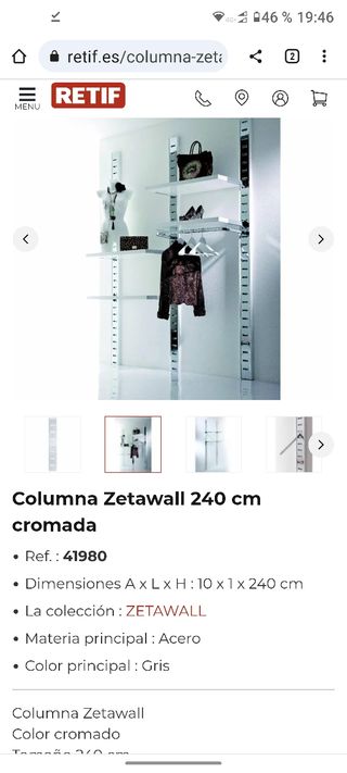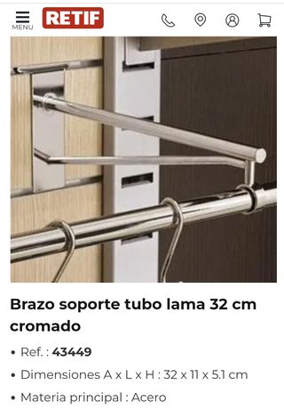 Estructura para colgar ropa, con DOS barras (una de 219cm y otra sin estrenar de 300 cm), 6 brazos soporte tubo 32cm cromado, y 3 columna zetawall cromadas (de 195 cm. de altas). Todo es acero cromado. Todo de la marca Retif profesional para tiendas. Ideal para tiendas de ropa, para vestidor, para ropero, armario... mobiliario