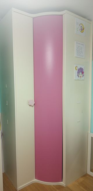 Precioso armario esquinero infantil, ideal para una habitación de niña. Tiene un diseño curvado y elegante. - Perfecto estado. - Dos puertas, una rosa y otra blanca. - Tirador con forma de nube.