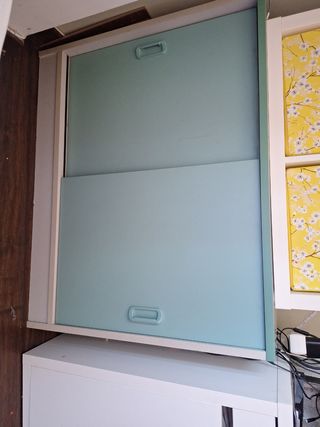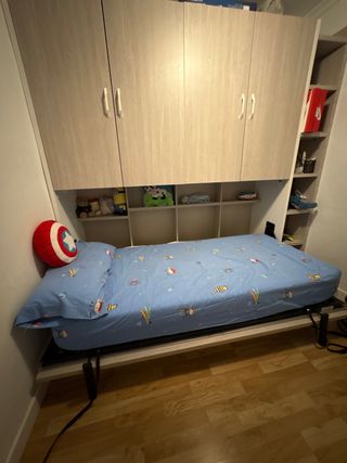 Tengo dos iguales Armario modular con cama abatible y gran espacio de almacenamiento. - Diseño moderno en blanco y azul. - Fabricado en madera y plástico. la madera es especial anti rayaduras y golpes el armario puede ir seguido de la cama o ponerlo separado