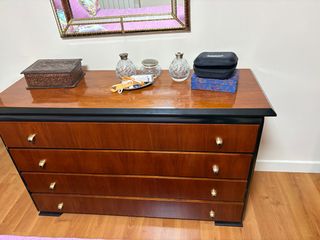 Preciosa armario de madera maciza, ideal para dormitorio. Se encuentra en buen estado. - Cuatro puertas amplias. - Tres cajones en la parte inferior. - Diseño clásico y elegante. Se puede vender con cómoda y espejo a juego y escritorio.