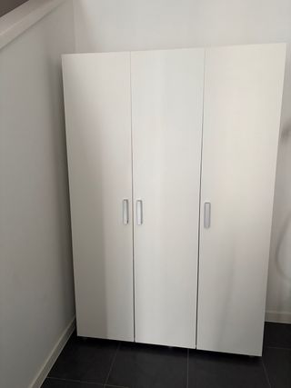 Armario de tres puertas de Ikea, en color blanco y fabricado en madera. Es un armario espacioso y de líneas sencillas. - Perfecto para dormitorios o vestidores. - Tres puertas con tiradores metálicos. - Diseño minimalista.