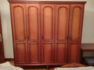 Armario de madera con un diseño clásico y elegante. - Cinco puertas. - Tiradores dorados. - Detalles ornamentales en la parte inferior.
