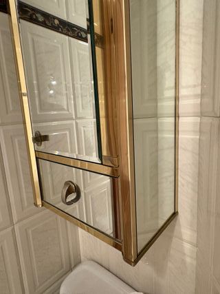 Armario de baño con acabado en metal dorado y espejo. - Diseño moderno y funcional. - Un cajón inferior y 3 baldas interiores. - Marco metálico. - Superficie de espejo. El tirador de la puerta está roto.