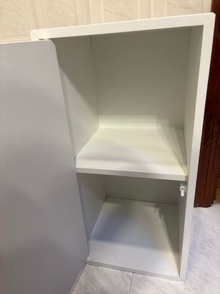 Armario con 2 puertas y una balda interior. Tiene un boquete en uno de los laterales de unos 10x10.