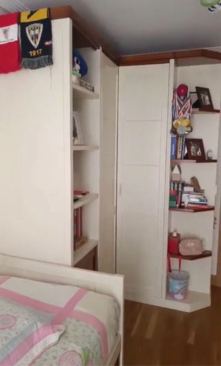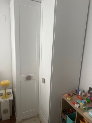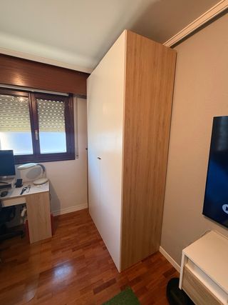 Armario de la marca Spaceo con un año de uso. Sus puertas blancas y su diseño moderno se adaptan a cualquier habitación. Me costó 500 € con el perchero telescópico, que también lo dejo, son dos módulos de ancho es 120, pero son módulos de 60 y 60 que se pueden desmontar. Tiene también tres baldas adicionales, además de las baldas que tiene. Entra muchísima ropa. No se envía. Vienes, y te lo llevas. - Color: Blanco y madera clara. - Material: Madera