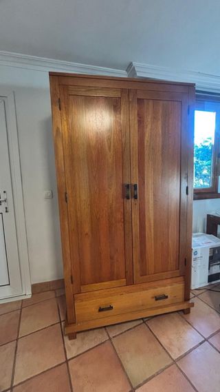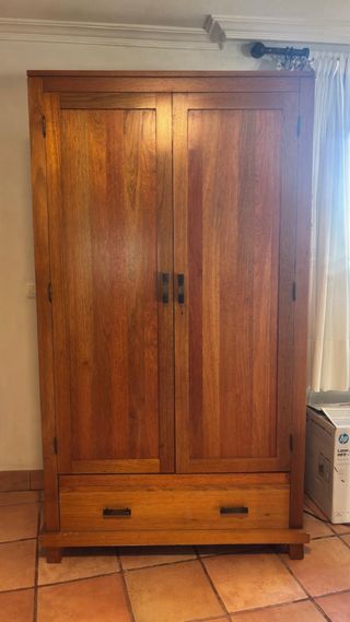 Armario de madera con un diseño clásico y elegante. Cuenta con dos puertas y un cajón inferior. - Tiradores metálicos. - Acabado natural de la madera.