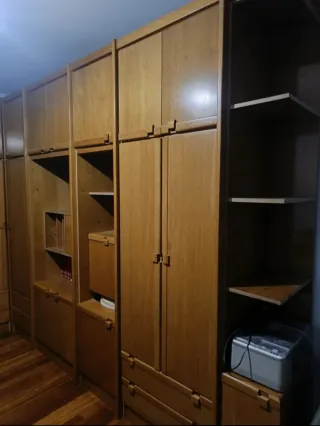 Armario de gran capacidad con puertas correderas. - Medidas: 200 cm de ancho, 66 cm de fondo y 236 cm de alto. - Acabado en imitación madera. - Diseño moderno y funcional. - Viene con cajones en ambos lados - Tiene luces - Tiene dos pequeños desperfectos, se ven en la fotos. Con un poco de betún se disimularia. El resto del mueble como nuevo. Precio original más de 800 euros, lo vendo por 500 negociables. Se requiere desmontaje por parte del comprador.