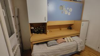 Conjunto de dormitorio con dos camas, una abatible y otra nido, ideal para optimizar el espacio. Incluye una mesa extraíble, dos armarios y tres cajones de almacenaje - Estructura principal de madera. - Detalles en metal.
