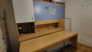 Habitación de madera robusta. Compuesta por dos camas de 90. Estantería superior con repisa y armario. Mesa y cajonera con ruedas (movible) y madera extensible al final para meter cosas debajo y poner cosas encima Medidas armario superior: 69 largo. 14 alto.27 profundo. Mesa 1,53 largo y ancho 53 y luego se estrecha a 35 Prolongación adicional 60x1 metro Cajonera:alto 58 Ancho 43 y profundo 15g No incluye colchón de encima, la silla y adornos