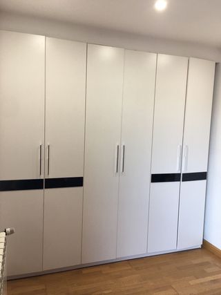 Armario modular Pax de Ikea con medidas de 300x236x66 cm. Puertas correderas de cristal templado. En muy buen estado menos una cajonera suelta que es fácil de arreglar. Desmontaje y traslado por cuenta de comprador. Último día sábado 31 por tener que entregar la casa. - Estructura de madera en color beige. - Incluye barra para colgar. - Estantes y cajones de madera. - Cestas metálicas extraíbles.