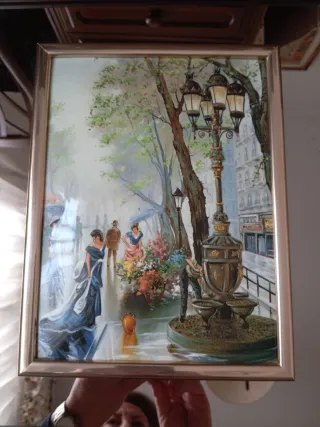 Armario decorativo con espejo y marco de madera. Sé sujeta a la pared con dos tirafo dos y en apariencia parece un cuadro, externamente no lleva cierre ni bisagras. En el centro lleva una pintura clásica, la rodea un espejo y luego el marco de madera. Todo ello mide 44*38*8 cm. Está como nuevo. - Marco de madera con detalles dorados. - Espejo central. - Diseño clásico y elegante.