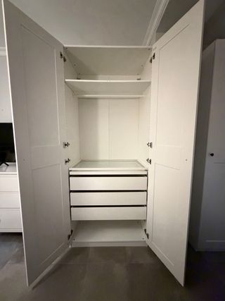 Armario familiar de gran tamaño, perfecto para organizar ropa y accesorios. Cuenta con 4 cajones inferiores. - Amplio espacio interior. - Diseño de madera clara. - Tiradores metálicos. El comprador debe encargarse del transporte del armario. Precio NEGOCIABLE