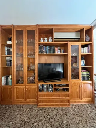 Se vende comedor completo en madera,esta en perfecto estado.precio 1300€ todo,mesa y 6 sillas,mesa fumador,mueble tv,vitrina,y aparador