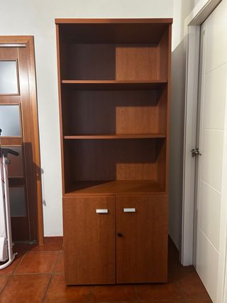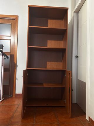 Armario de madera con un diseño clásico y elegante. - Dos puertas con tiradores metálicos. - Detalles tallados en la parte superior. - Acabado en tono marrón oscuro. No envío, venir a recoger.