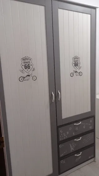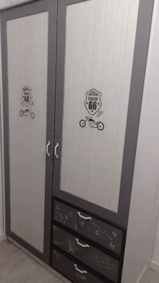 Armario de madera. Presenta un acabado en dos tonos que le da un toque moderno, pintado a mano. Puertas con diseño de escudo y moto Route 66. Cajones decorados con letras y dibujos estilo tiza. Está bastante usado pero bien conservado algunos roces, unas de las barras está soldada y hace la función correctamente, en la parte de abajo la madera está un poco bufanda. Está montado y quien se lo quede tiene que desmontarlo es un primero sin ascensor. Medidas; Alto 2 metros - Ancho 1,,22cm - Fondo 0,59 cm -