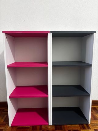 Tengo dos armarios de color rosa, y uno color gris. (Cada uno a 10€) - Dos estanterías tienen detalles en color rosa fucsia. - La otra estantería tiene detalles en color gris oscuro. - Diseño moderno y funcional. -Son desmontables Envío rápido! 🚚