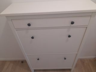 Zapatero de la serie Hemnes de Ikea en color blanco. Un mueble práctico y elegante para organizar tu calzado. Medidas: 89-30-127cm - Diseño de tres compartimentos abatibles. - Tiradores negros redondos.