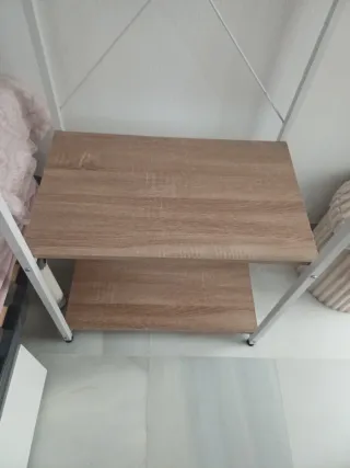 Escritorio con un diseño moderno y funcional, ideal para cualquier habitación. - Encimera de madera clara. - Cajones frontales en color rosa. - Tiradores metálicos plateados. - Tiene armario y estantería a juego también en venta. - Armario 70.- y estantería 15.-€