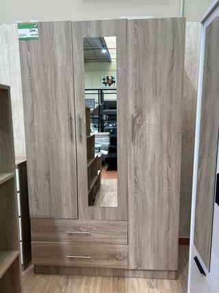 Armario de gran capacidad con un diseño moderno y funcional. - Tres puertas de acceso. - Espejo integrado en una de las puertas. - Dos cajones inferiores para almacenamiento adicional. - Acabado en tonos madera. Medidas: Alto: 200 cm Largo: 120 cm Ancho: 52 cm ✅Envíos a domicilio(Nivel Nacional) ✅Pagas al momento de la entrega ✅Garantía de 3 años(artículos nuevos de fabrica