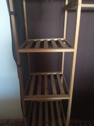 Armario compacto con barra para colgar ropa y estantes inferiores. a - Barra metálica. - Estantes de madera. - Diseño moderno