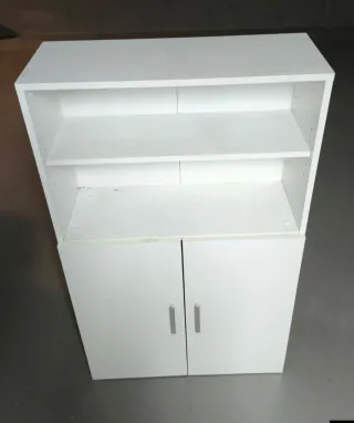 Mueble de almacenamiento con un diseño moderno y funcional. - Dos puertas inferiores con tiradores plateados. - Dos estantes abiertos en la parte superior. - Acabado en color blanco. Medidas Alto 104cm aprox Fondo 24,4cm aprox Ancho 64cm aprox