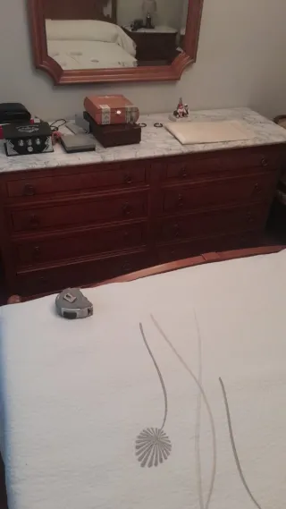 Mueble de dormitorio de madera con acabado de calidad. Cama 1'35, cabecero, mesillas con encimera mármol,cómoda con espejo. Regalo colchón 135*190. Posibilidad de armario ropero a juego de 170cm* 200 (alto). Precio dormitorio completo con armario 250 - Diseño clásico. - Cajones amplios. - Encimera de mármol.