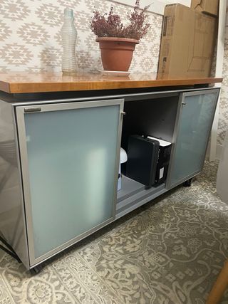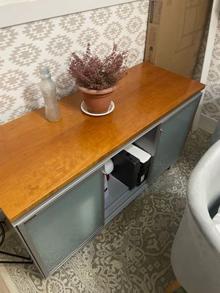 Armario bajo madera, metal y cristal
