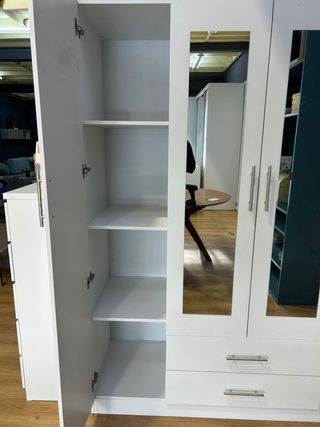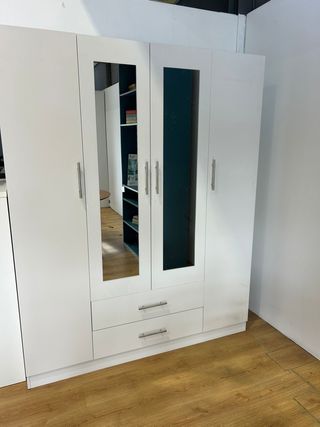 PAGA EN CASA!!!! Nuevo modelo de armario con 4 puertas Con dos cajones añadidos Dos espejos en las puertas interiores En el medio dispone de espacio para colgar y en los laterales espacio con baldas Con tiradores metálicos Medidas 160x200x52cm Ofrecemos entrega Pago contrareembolso