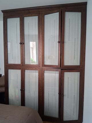 Armario ropero de madera con puertas de cristal. Se encuentra en buen estado. Sus dimensiones son 260 cm de alto, 190 cm de ancho y 60 cm de profundidad. No se incluye desmontaje ni transporte. - color: Marrón - Puertas de madera con paneles de cristal. - Tiradores redondos. - Diseño de líneas verticales en los paneles.