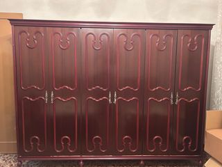 Armario de madera con seis puertas, y 6 cajones en buen estado. - Acabado en tonos marrones y rojos. - Diseño clásico con detalles ornamentales. IMPRESCINDIBLE DESMONTARSELO Y LLEVARSELO.