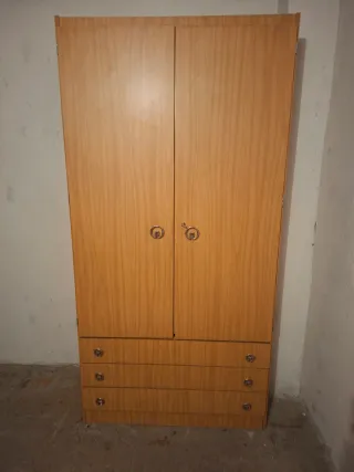 Armario de madera con un diseño clásico y funcional. - Dos puertas principales. - Tres cajones inferiores. - Tiradores metálicos.