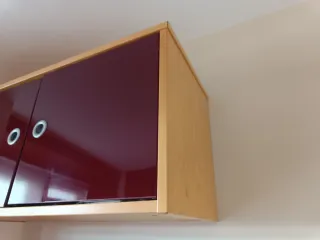 Armario moderno pared con puertas en color rojo y verde brillante. Ideal para almacenamiento. Cocina o salón. Medida rojo: 60x60cm Medida verde: 40x120cm Ambos 35cm de profundidad. 40 cada uno. El verde tiene la bisagra un poco vieja pero se puede arreglar.