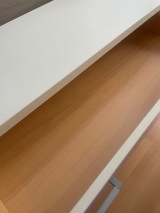 Armario IKEA PS pintado de balnco con madera de pino natural encima. Se ha usado como zapatero y mueble para la entrada. Se vende por mudanza. - Estructura principal de metal. - Tapa superior de madera. - Dos puertas con rejillas decorativas. - Patas metálicas.